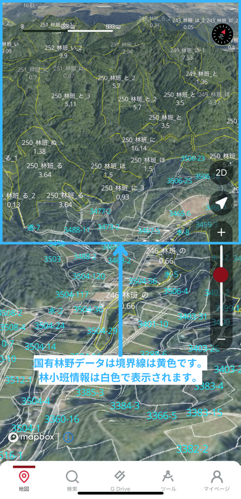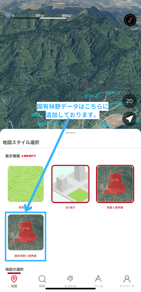 固定タブバーの「地図」より「国有林野と境界線」をタップいただくことで地図上での表示/非表示を行えます。(以下写真の国有林野データ①を参照)
