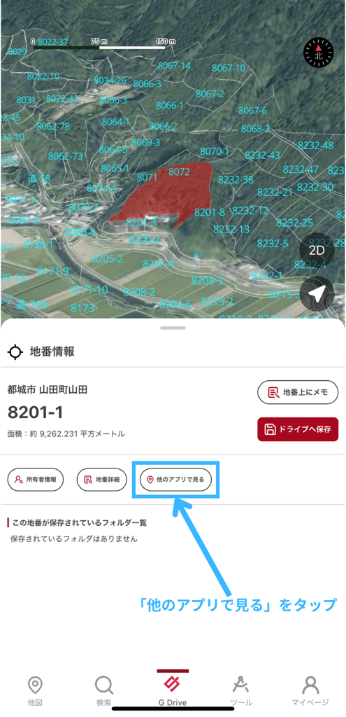 他の地図アプリでの最新航空写真の確認や地番までのおおよそのルート案内がご利用いただけます。「他のアプリで見る」ボタンをタップいただきますと以下のアプリへ移動します。(以下写真水色枠部分参照)