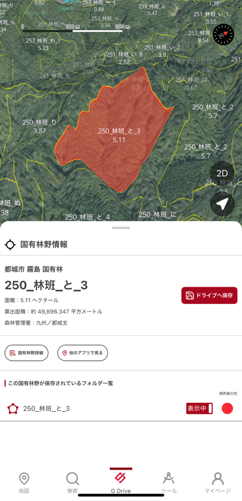 地図上の国有林野データをタップいただきますと以下の詳細情報が表示されます。