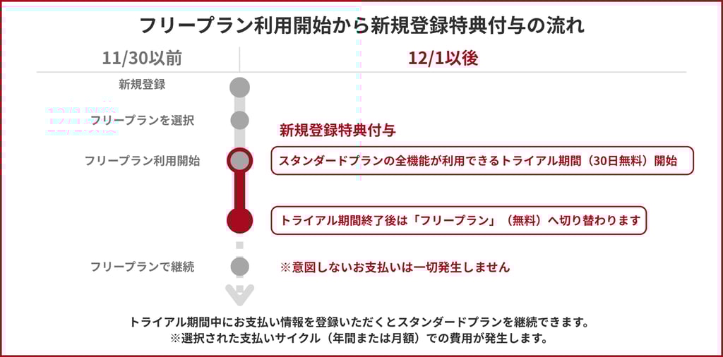 - 12月1日以降: フリープランを選択 → フリープラン契約のまま、30日間スタンダードプランの全機能が使い放題